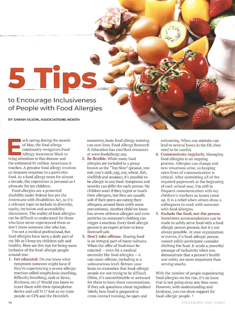 Thanks to encouragement from this client, I wrote an article for the EDIA column in the 2nd quarter 2023 issue of Focus North, which was just published yesterday! For people living with food allergies, knowing what foods to avoid and how to treat emergencies is only half the battle; they also have to learn to navigate social and cultural situations, and it’s helpful if others are supportive.