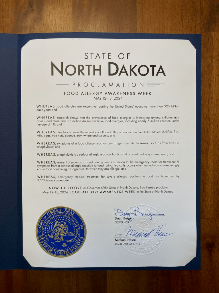 May is Food Allergy Awareness Month, and I’m so excited to kick it off by thanking Governor Doug Burgum for proclaiming May 12-18, 2024 as Food Allergy Awareness Week in North Dakota! Being a food allergy parent is the most difficult role I’ve ever had – a long journey with a steep learning curve. But while we did not choose this life, we can choose how we respond to it. I advocate for my children and all those living with food allergies because a little kindness, compassion, and understanding make a world of difference.